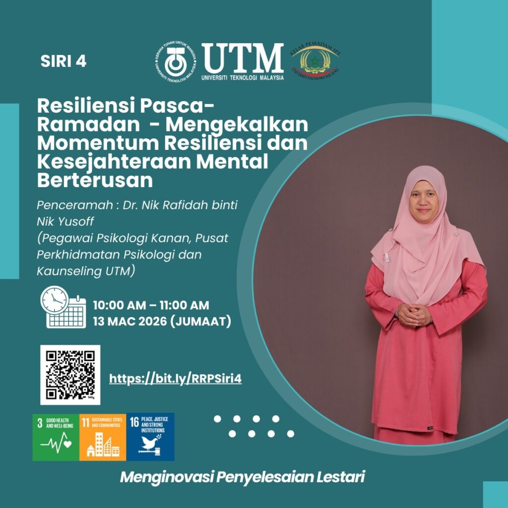 March 13 @ 10:00 am - 11:00 am Webinar Ramadan dan Resiliensi Psikologi – Resiliensi Pasca-Ramadan: Mengekalkan Momentum Resiliensi & Kesejahteraan Mental Berterusan Online