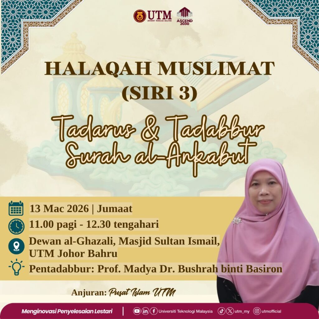 March 13 @ 11:00 am - 12:30 pm Program Halaqah Muslimat : Tadarus & Tadabbur Surah al-Ankabut Dewan Al-Ghazali, Masjid Sultan Ismail, UTM Johor Bahru