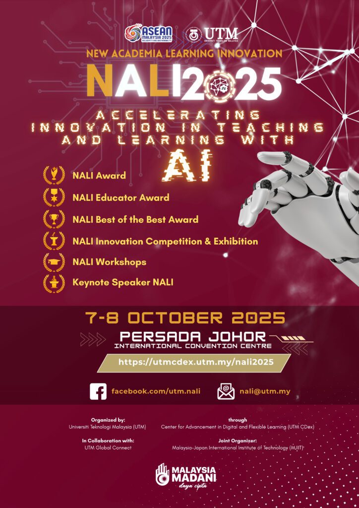 The UTM Center for Advancement in Digital and Flexible Learning (UTM CDex), in collaboration with UTM Global Connect, is excited to announce the return of New Academia Learning Innovation (NALI) 2025 — an extraordinary platform to accelerate innovation in teaching and learning.