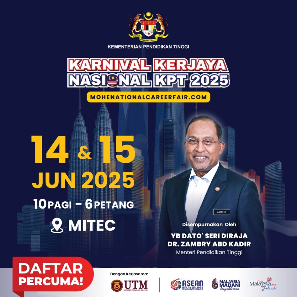 The Ministry of Higher Education (MOHE) proudlyΒ presents the MoHE National Career Fair 2025 (Karnival Kerjaya Nasional KPT) - a premier platform designed to connect top university talent with leading employers from across the country. This nationwide initiative will be officiated by YB Dato' Seri Diraja Dr. Zambry Abd Kadir, Minister of Higher Education Malaysia. Organised […]