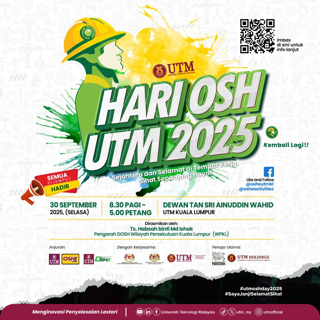 ππͺ HARI OSH UTM 2025 πͺπ Sukacita dimaklumkan bahawa Seksyen OSHE UTM Kuala Lumpur dengan kerjasama Pejabat OSHE UTM dan Jabatan Timbalan Naib Canselor (Pembangunan) UTM Kuala Lumpur akan menganjurkan Program HARI OSH UTM 2025 pada 30 September 2025 (Selasa) bertempat di Dewan Tan Sri Ainuddin Wahid, UTM Kuala Lumpur, bermula dari jam 8.30 […]