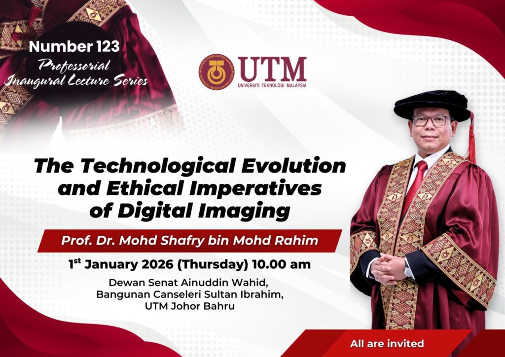January 1, 2026 @ 10:00 am - 11:30 am Professorial Inaugural Lecture – The Technological Evolution And Ethical Imperatives of Digital Imaging Dewan Senat Ainuddin Wahid, Sultan Ibrahim Chancellery Building, Universiti Teknologi Malaysia, Johor Bahru