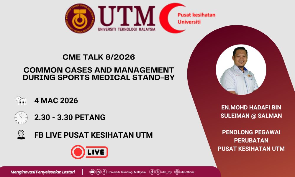 March 4 @ 2:30 pm - 3:30 pm Ceramah Kesihatan : Common Cases and Management During Sports Medical Stand-by Online