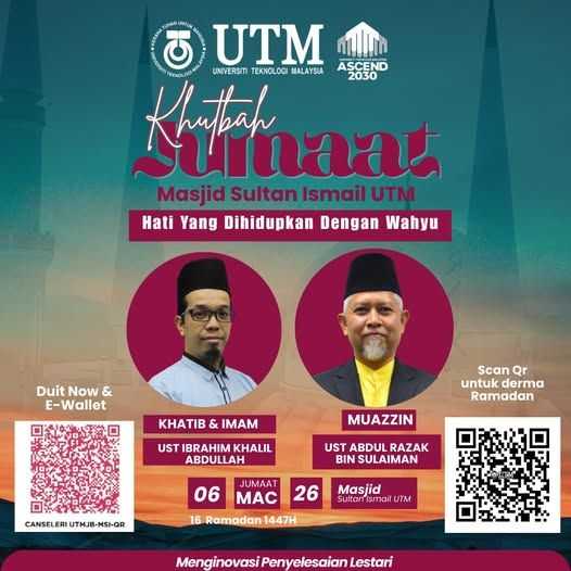 March 3 @ 4:00 pm - 9:00 pm Majlis Tadarus, Khatam Al-Quran & Iftar Perdana Peringkat Universiti 1447H/2026M Dewan Solat Utama, Masjid Sultan Ismail, UTM