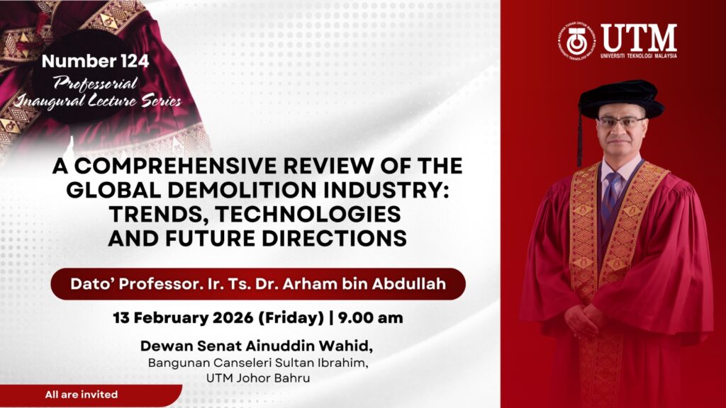 March 13 @ 9:00 am - April 10 @ 10:30 am Syarahan Perdana Profesor Oleh Dato’ Prof. Ir. Ts. Dr. Arham Bin Abdullah : Tinjauan Komprehensif Industri Perobohan Global: Trend, Teknologi Dan Hala Tuju Masa Depan Dewan Senat Ainuddin Wahid, Bangunan Canseleri Sultan Ibrahim, UTM Johor Bahru , Malaysia