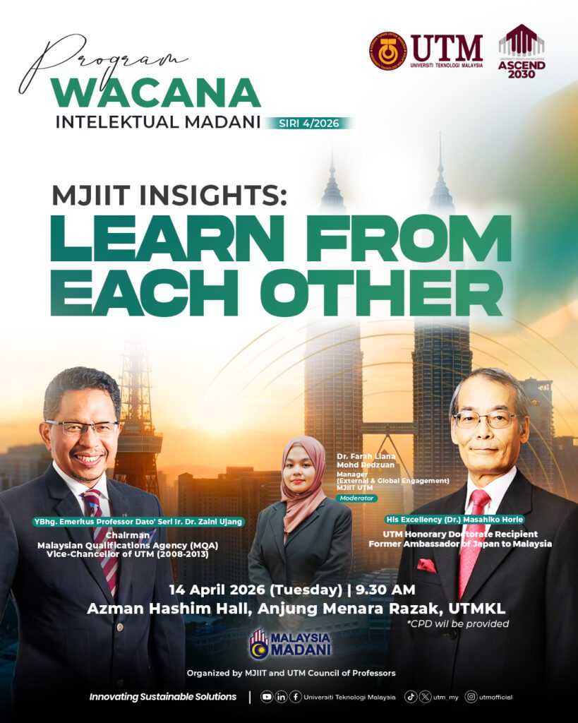 April 14 @ 9:30 am - 10:30 am Wacana Intelektual Madani : MJIIT Insights Learn From Each Other Dewan Azman Hashim, Menara Razak, UTM Kuala Lumpur