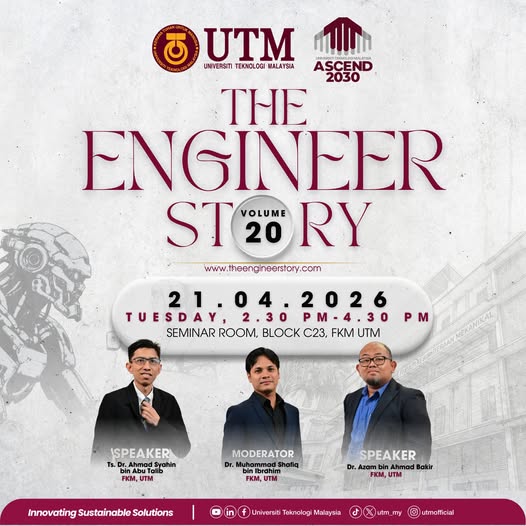April 21 @ 2:30 pm - 3:00 pm The Engineer Story Seminar Room, Block C23, Faculty of Mechanical Engineering, UTM
