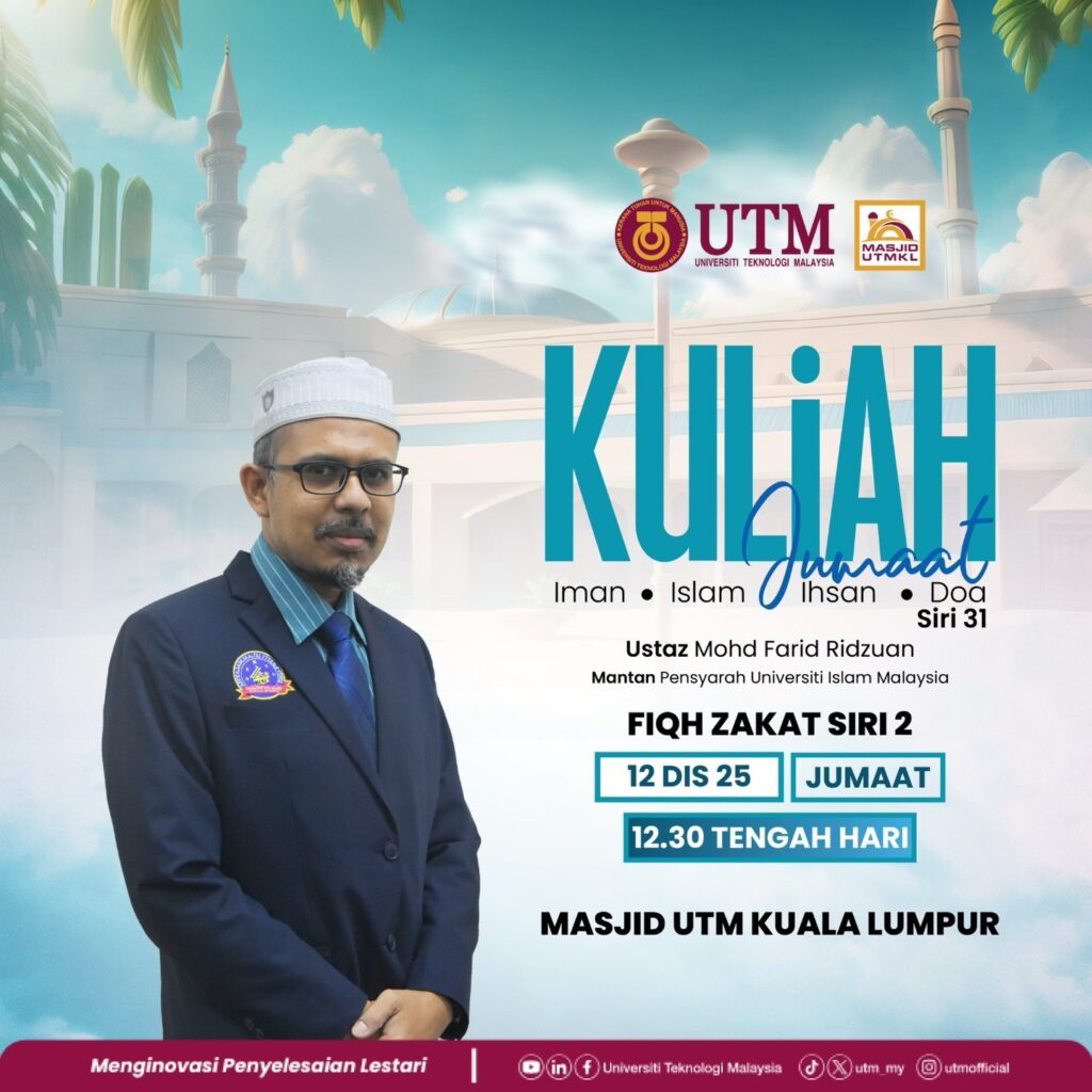 December 5 @ 1:00 pm - 2:00 pm Khutbah Jumaat UTMJB : Rezeki Halal Yang Mengalir Ke Hati Dewan Solat Masjid Sultan Ismail, UTM Johor bahru , Malaysia